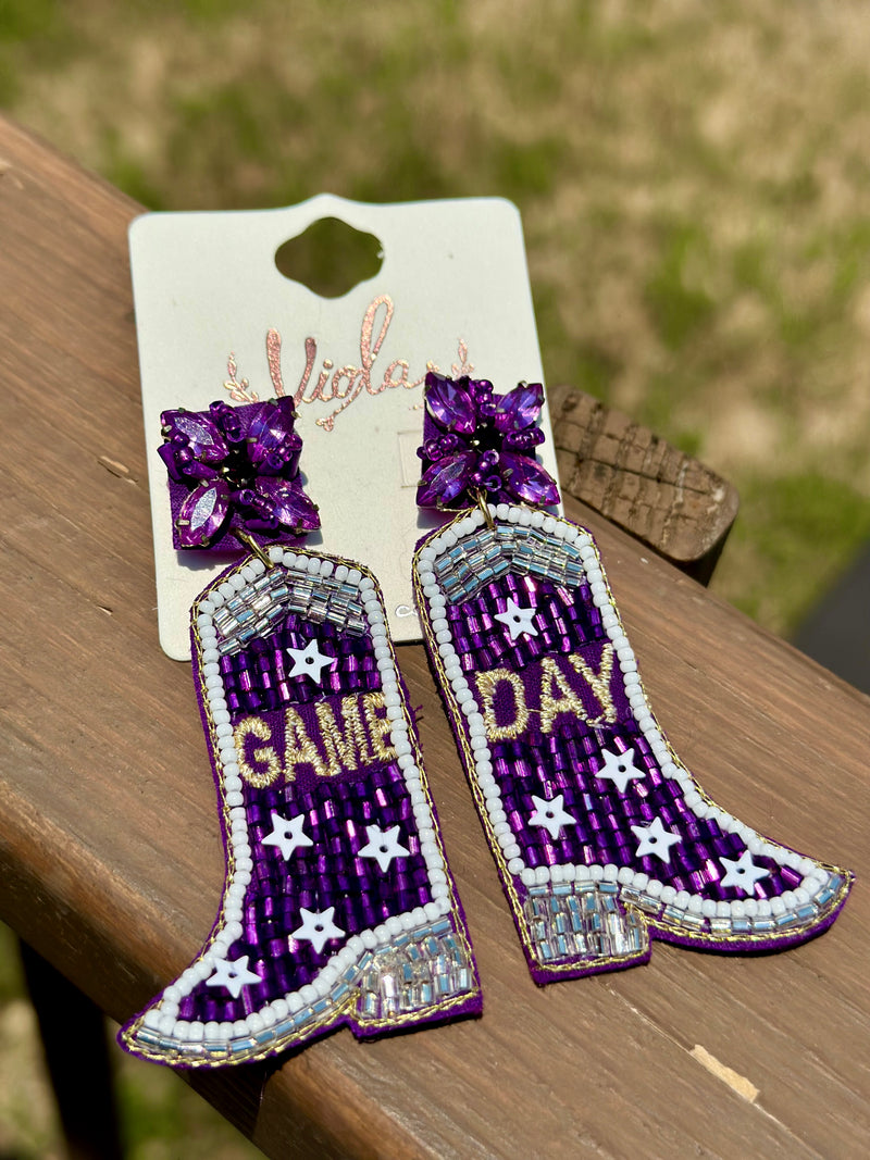 Purple game day boot beaded earrings.