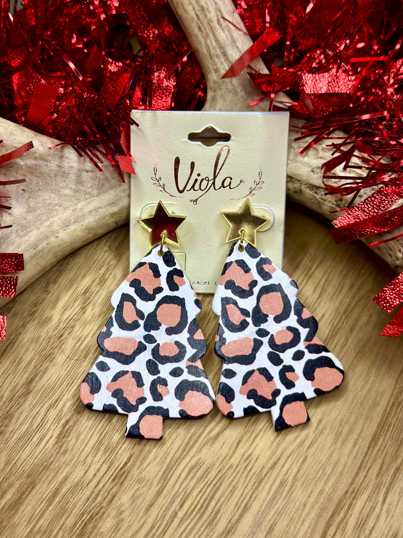 Leopard Christmas tree earrings. These earrings are wooden and light weight.
